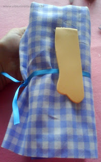 Agora, faça um "cinto" com um pedaço de fita e com o EVA, faça dois bracinhos e cole nas laterais da caixa