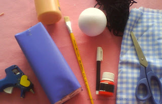 Você precisará de: uma caixa de leite ou suco de fundo quadrado, retalhos de tecido, uma bolinha de isopor, tinta guache, acrílica ou de tecido cor da pele para pintar a bolinha, caneta permanente, tinta vermelha (para as bochechas),um pedaço de lã para o cabelinho, cola quente e tesoura.