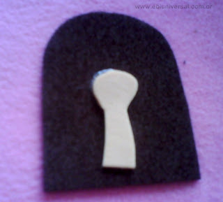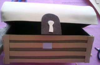 Agora faremos a fechadura do baú, também feita com eva ou papel colorido. Atrás dela colaremos um pedacinho de velcro e na frente da caixa também, para que grude uma na outra quando fecharmos o baú